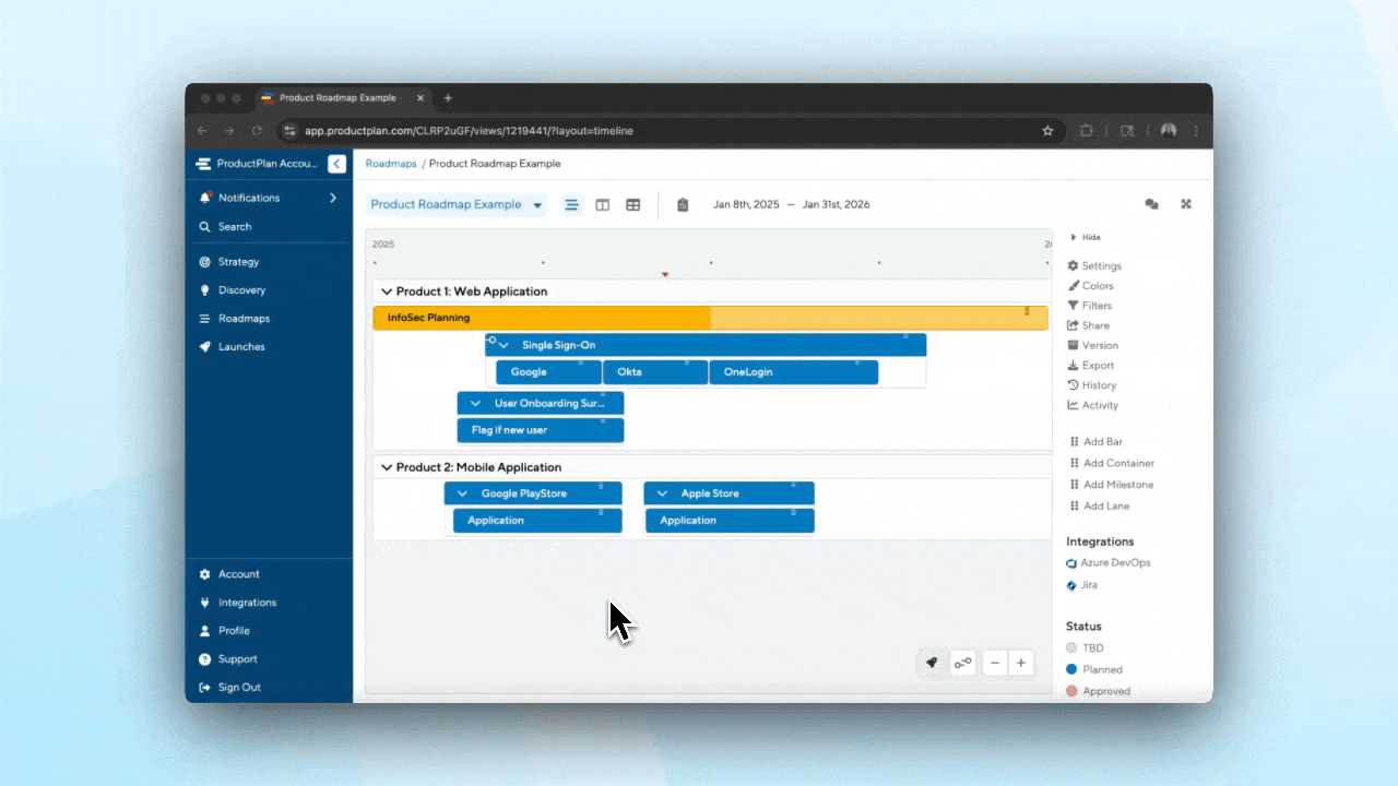 You can add new Bars by dragging and dropping them from the menu. You can quickly move or shift Bars on your roadmap by dragging and dropping them, but ProductPlan also provides a few ways to make this easier.