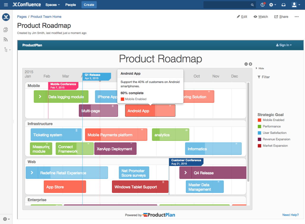 Atlassian Confluence is a great way to create product or marketing team pages. Many ProductPlan customers are taking their pages a step further and integrating their live Roadmaps directly into Confluence. This can give stakeholders throughout your organization easy access to your latest roadmap.