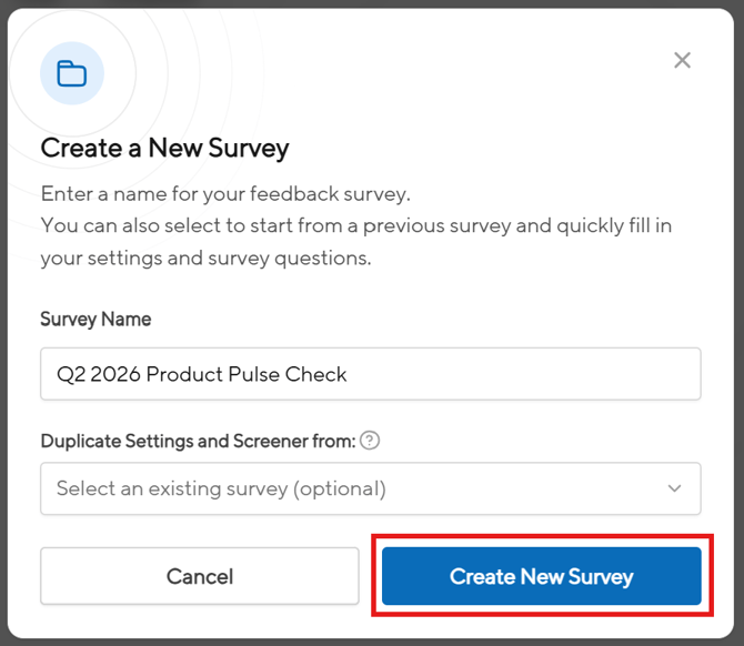 Click '+ Create New Survey' in the top right (or main dashboard if empty), enter a survey name, and click 'Create New Survey' to get started.