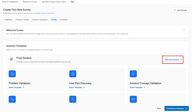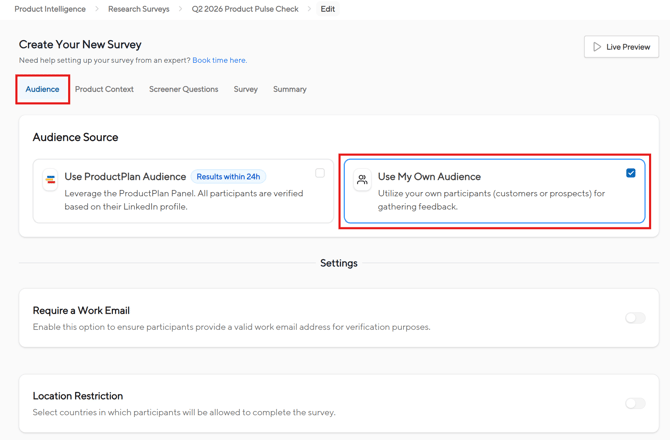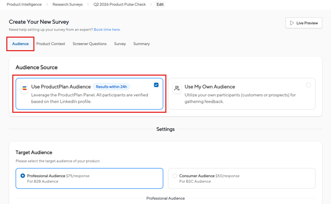 Select the option to survey LinkedIn-verified professionals recruited by ProductPlan.- Review pricing based on desired audience type.