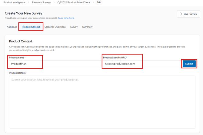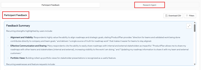 - If your account has access to AI features, ProductPlan will use your product context when analyzing participant responses and interacting with you in the Research Agent.