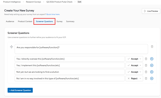 - Set up screener questions to appear before the main survey and qualify or disqualify participants based on their answers.
