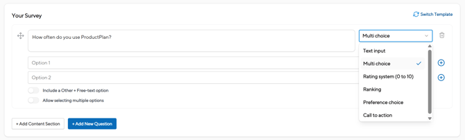 ProductPlan's research and survey capabilities bring customer intelligence and first-hand product discovery capabilities directly into your product planning workflow. With Research Surveys, your product teams can create surveys, recruit participants, analyze responses with AI, and explore their data all without leaving ProductPlan.