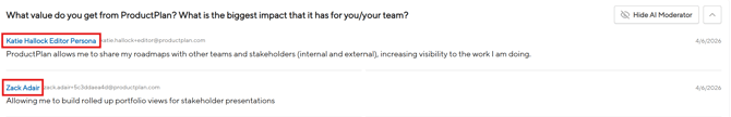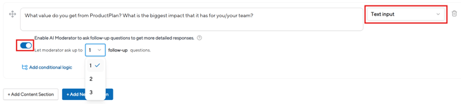 - ProductPlan Panel audience: The AI Moderator is on by default, and will ask up to 3 adaptive follow-up questions in real-time based on each participant’s response.