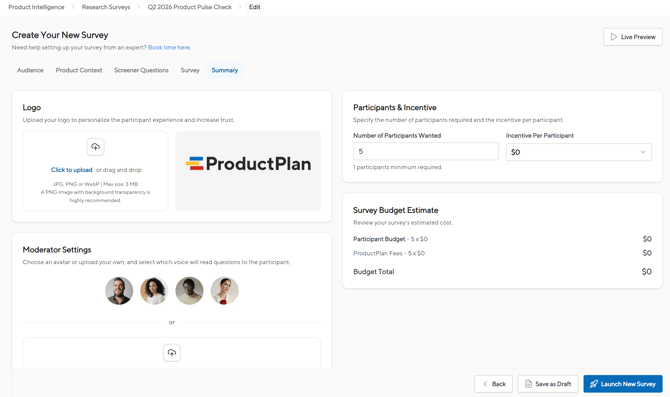 - BYO audience: You may choose whether to turn the AI Moderator on or off, with the number of follow-up questions configurable from 1 to 3.
