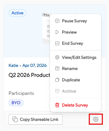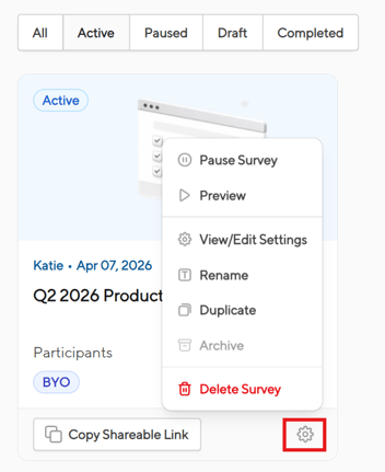 - View/Edit Settings: View your survey settings and edit settings of a paused survey.