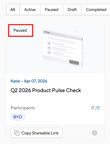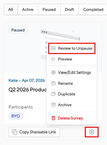 - To relaunch the survey, click the Settings menu on a Paused survey and select “Review to Unpause.”