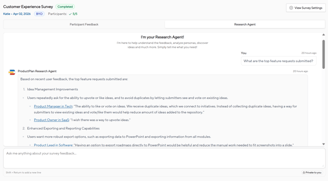 Great question! With any AI tool, the quality of the output is greatly impacted by the quality of the input. ProductPlan's Research Surveys help you capture feedback from real people who match your target customer. Our Research Agent will then review that research and answer any question that you have. All of your information is kept confidential from the AI platforms.